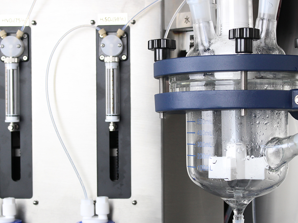 4.配酸組由3個(gè)注射泵和1個(gè)旋轉(zhuǎn)陶瓷泵(泵5)組成,如圖6所示,泵1(汲取硝酸)、泵2(汲取硫酸)、泵5(汲 取水) 按客戶需要的比例汲取相應(yīng)的硫酸、硝酸和水,按比例注入反應(yīng)釜。反應(yīng)釜自帶攪拌器將釜內(nèi)注入的溶液攪 拌均勻后就完成用戶需要的復(fù)合酸。泵3將反應(yīng)釜內(nèi)制好的復(fù)合酸直接抽入測(cè)汞儀內(nèi)。