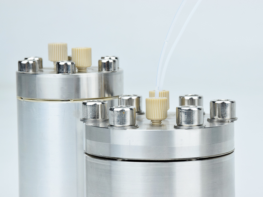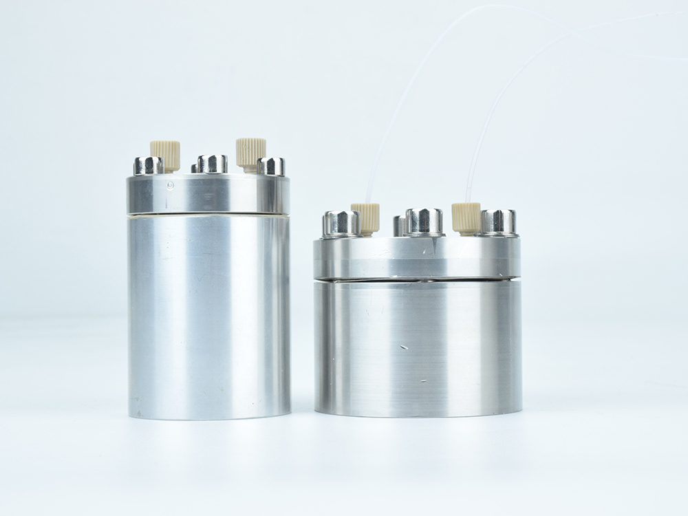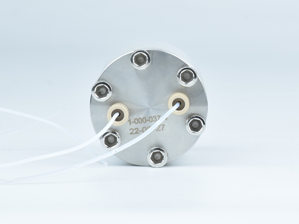 脈沖阻尼器 FS050輸出端軟管連接到阻尼器輸入,在輸出端接頭處連接一根輸出軟管至容器,即構成一個典型應用模式。適用流量范圍:50ul/min-50ml/min,10-32unf螺紋1/16管接頭;啟動柱塞泵,水流通過阻尼器時,這時由于流體壓力的作用,水流的湍流經過整流,消除柱塞切換產生的脈動,平穩輸出。