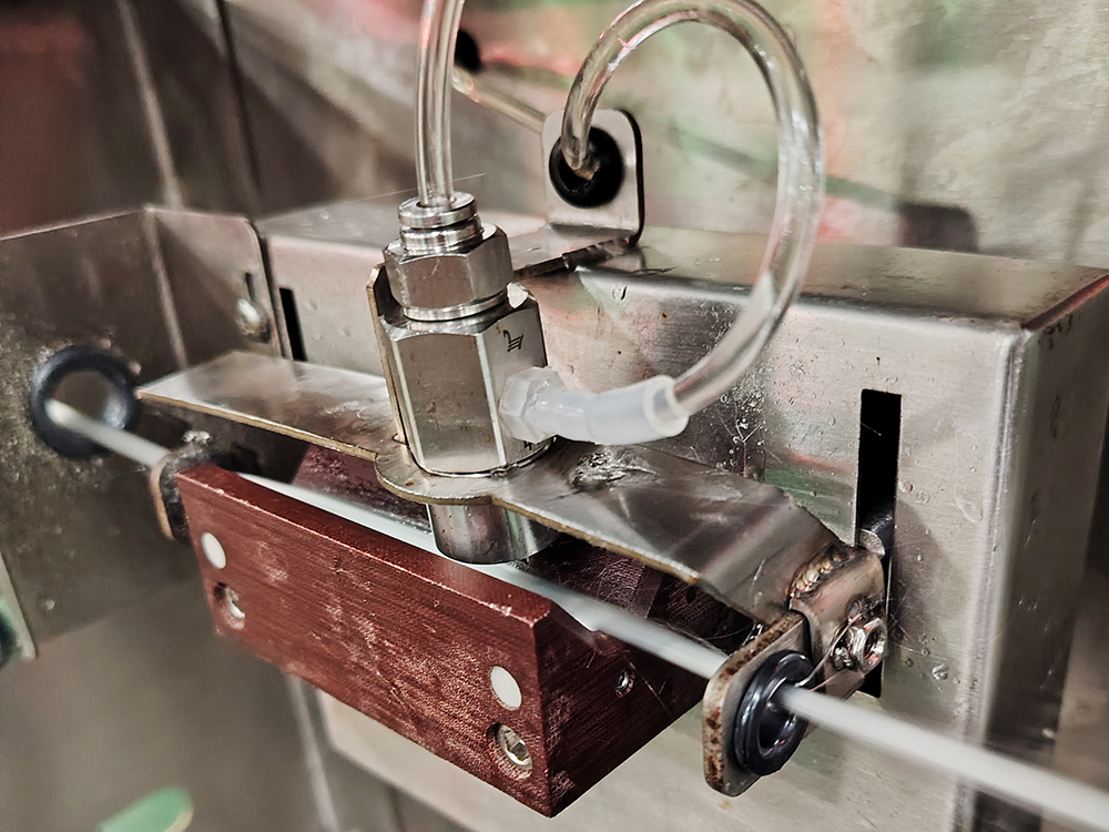 可通過調整噴頭壓力(0.2-0.5MPa)、噴霧角度(30°-90°)、紗線與噴頭的距離(5-15cm),快速適配不同規格的紗線(如單絲直徑 13-24μm 的粗旦紗),甚至可實現不同浸潤劑的分層噴涂。